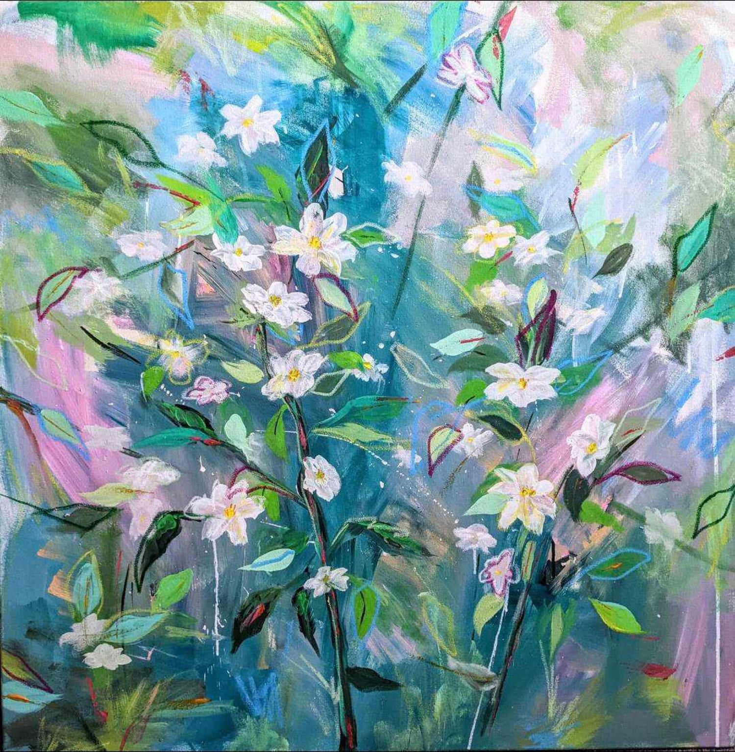 An original acrylic painting on canvas, framed in a white wood frame