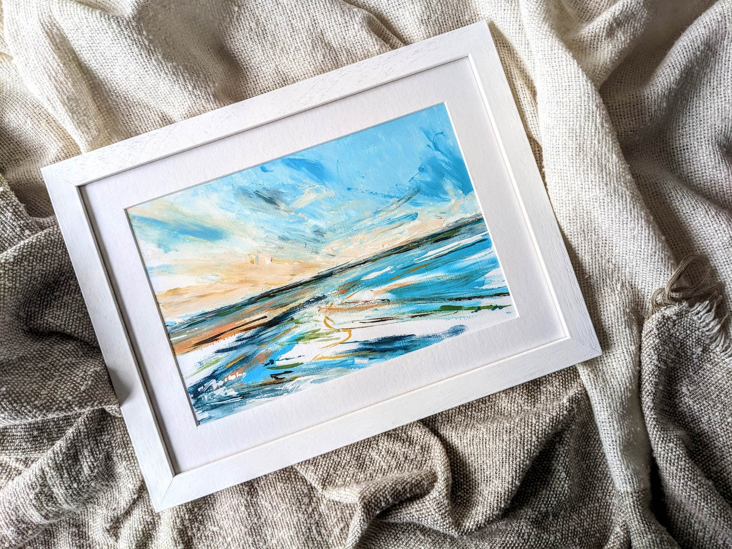 An original acrylic painting on canvas, framed in a white wood frame